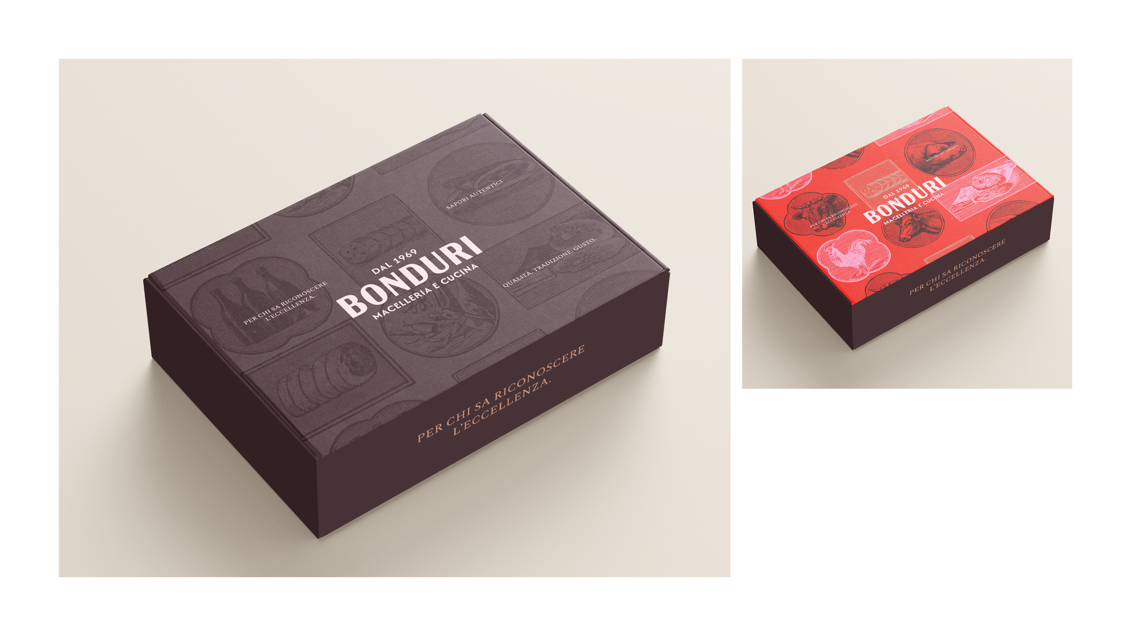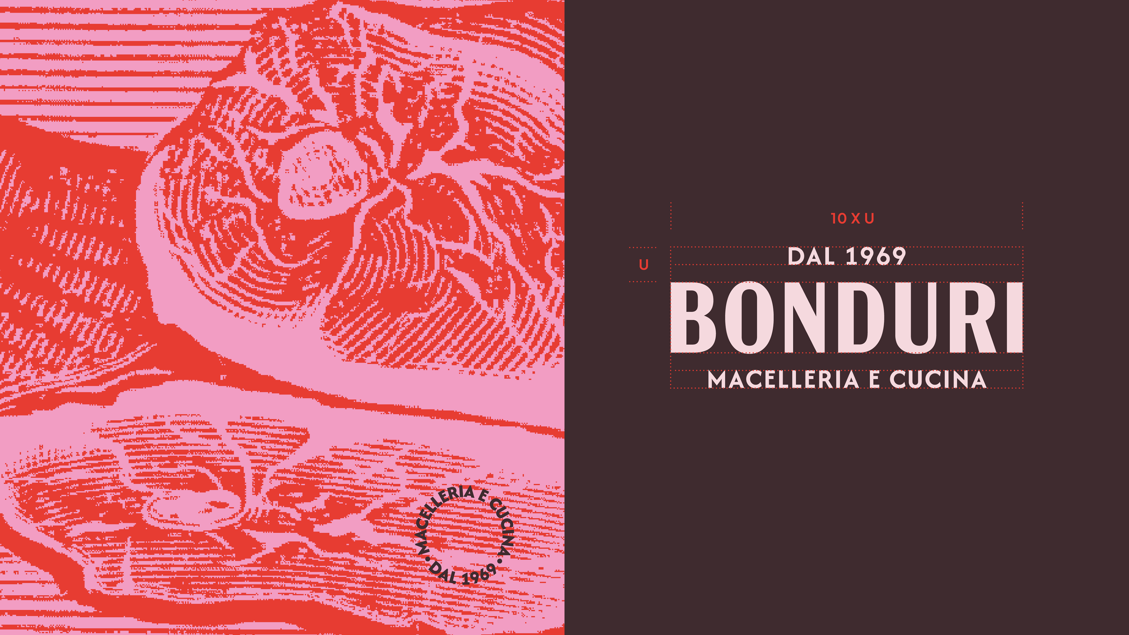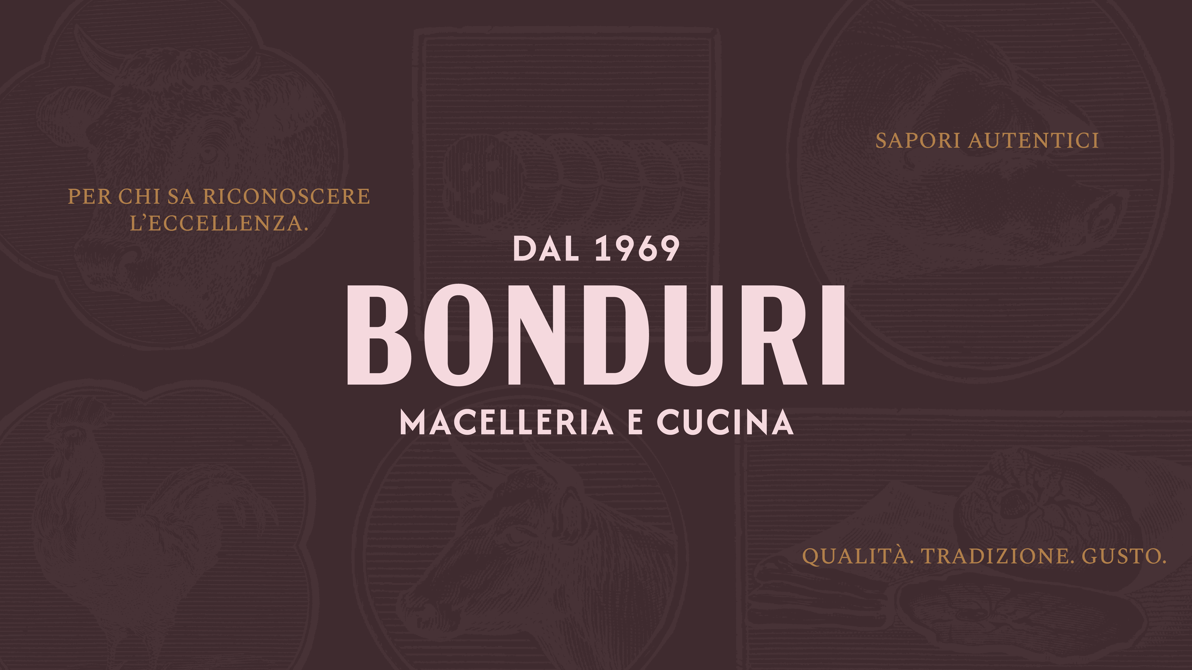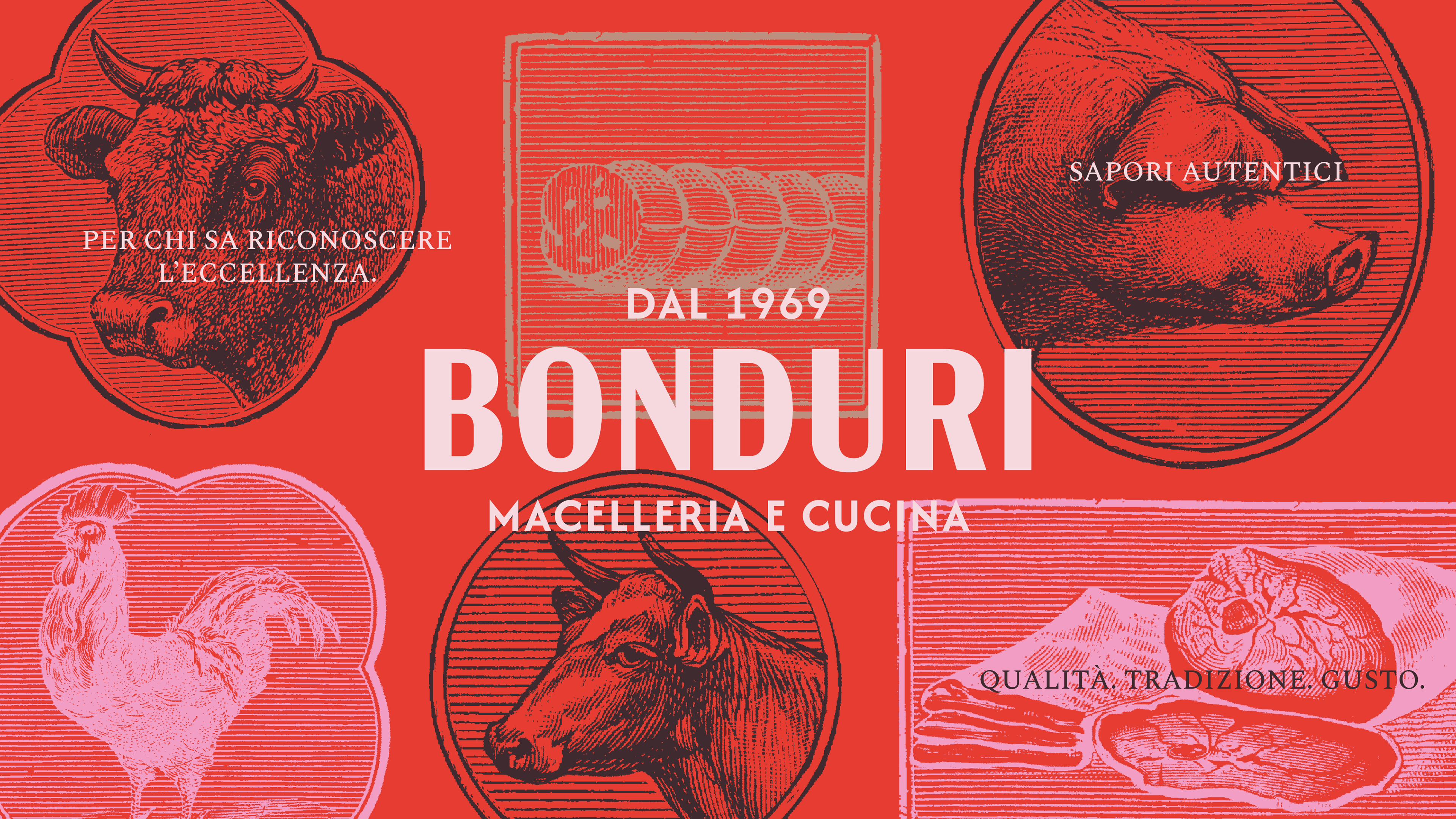 For the branding of Macelleria Bonduri, we chose a vintage style inspired by the historic signage of traditional butcher shops. We curated period illustrations of animals and meat-based dishes, using them to create patterns and graphic motifs that shape the entire visual identity. The color palette draws directly from the natural tones of meat, helping to build an authentic, warm, and tradition-rich brand image.