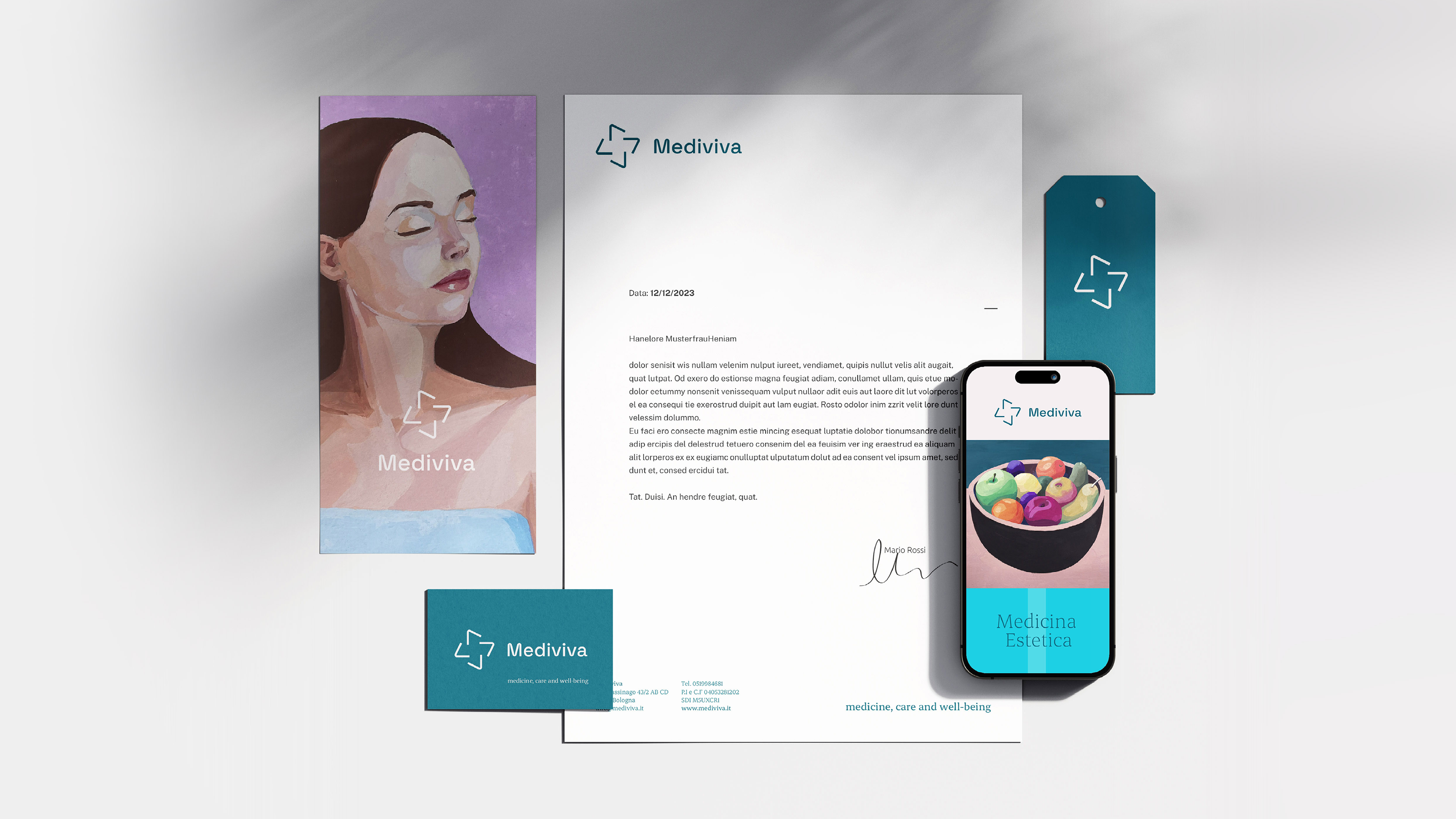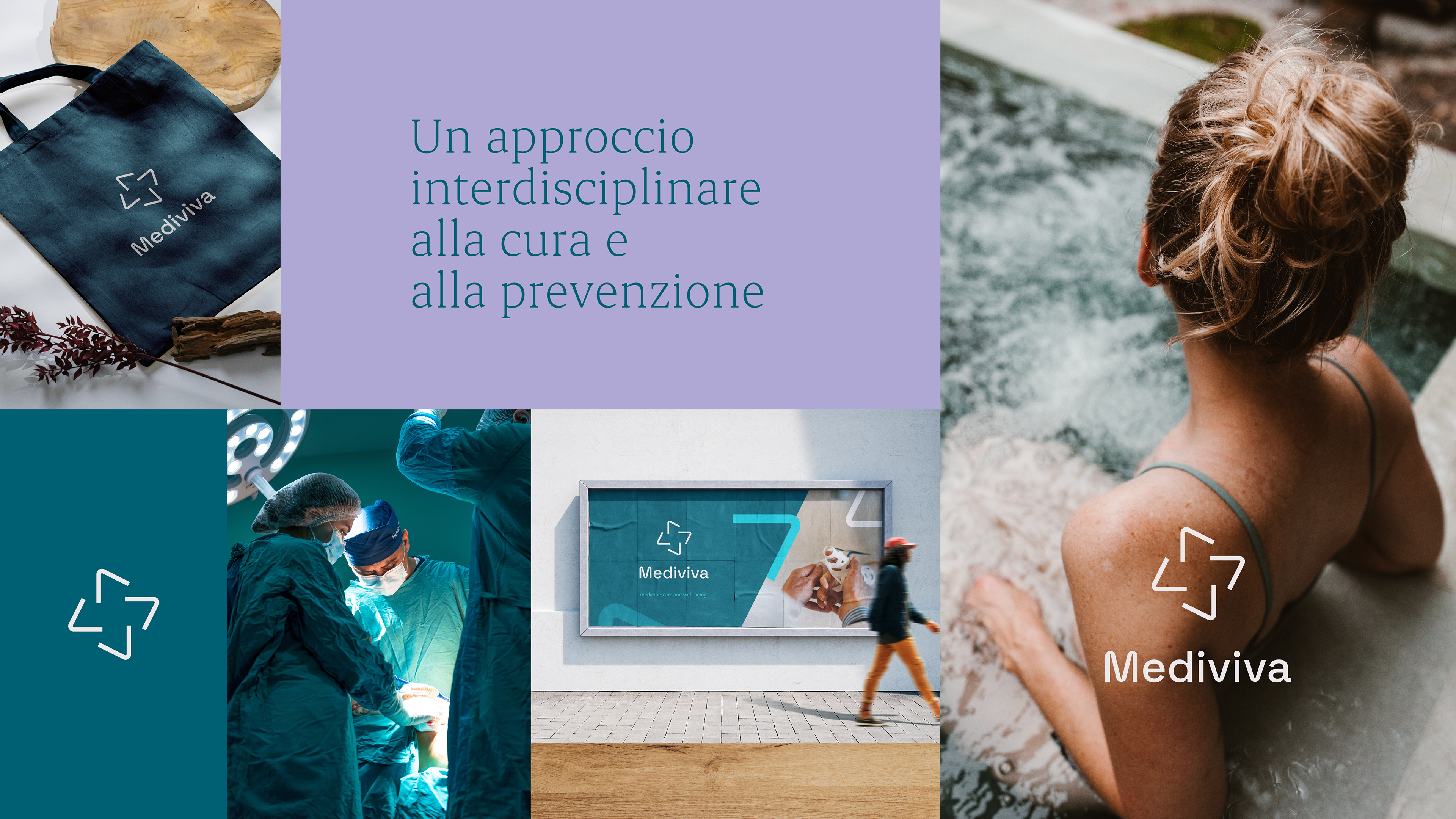 For Mediviva, we designed a logo that communicates the world of medicine in a clear and unmistakable way. The central cross is built from multiple arrows derived from the recurring “V” shapes in the name Mediviva; their multidirectional layout represents the interdisciplinary nature of the polyclinic. The logotype’s typography was crafted to harmonize with the symbol, while the color palette was defined in collaboration with the architect during the design of the clinic’s interiors. To distinguish the various services, we chose illustrations inspired by fine art—oil paintings that convey added value, warmth, and Mediviva’s deep attention to patient care, key elements of its identity. Mediviva is a polyclinic in Bologna that integrates specialist medicine, rehabilitation, and nutrition. It offers coordinated pathways for prevention, treatment, and functional recovery.