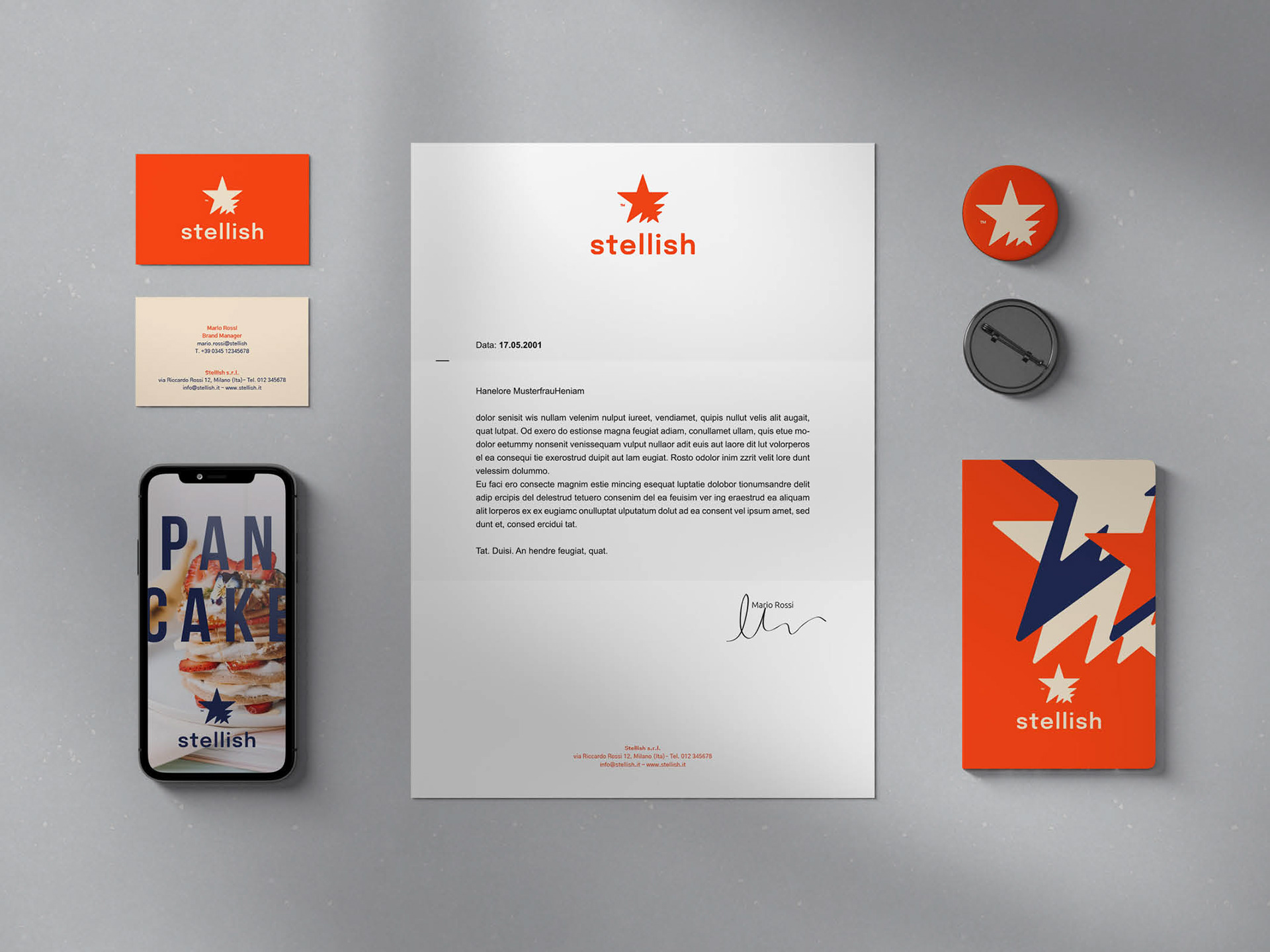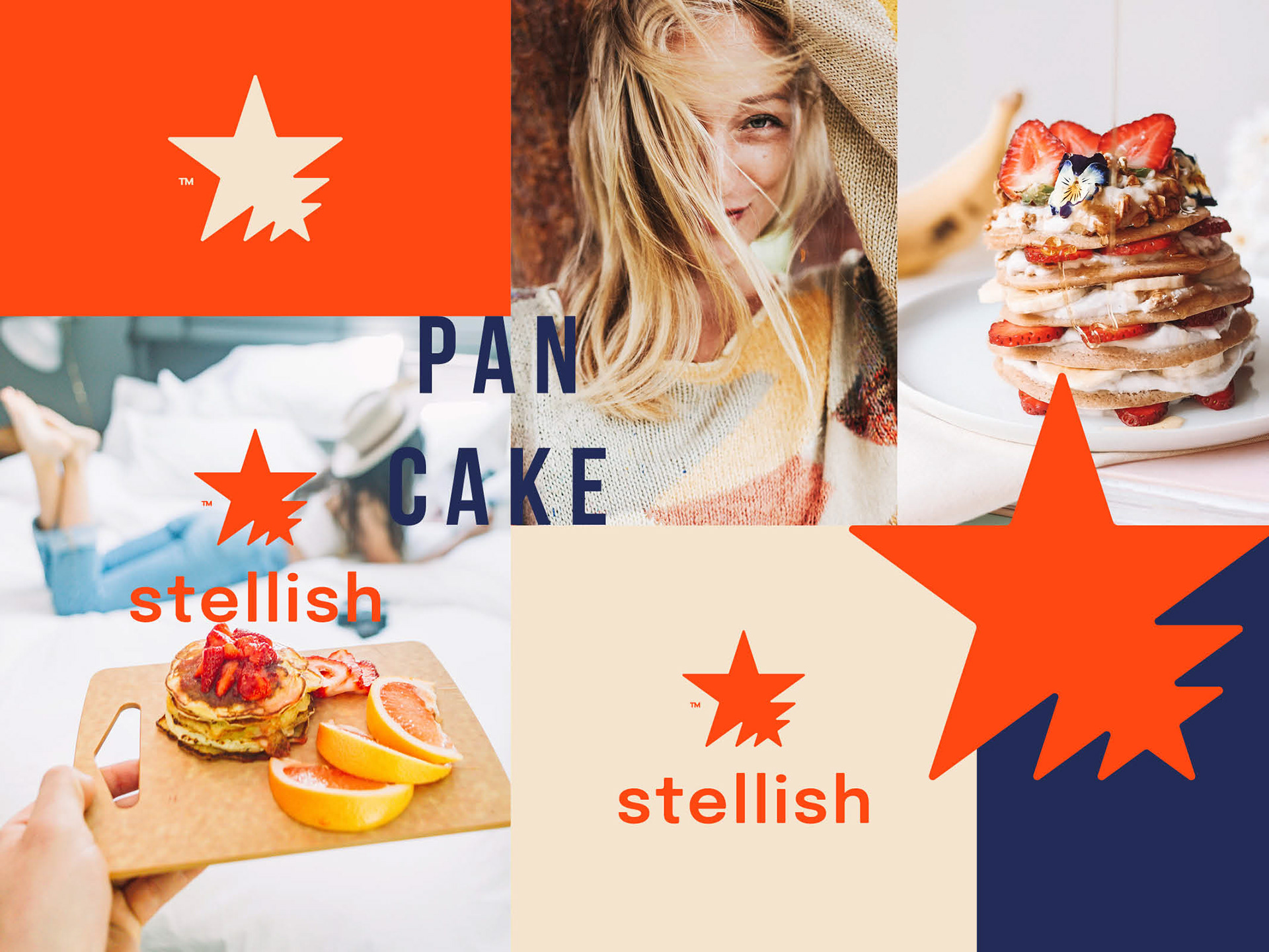 Brand design for a pancake mix "Stellish". Mix for rice protein pancakes low sugar, gluten free, from organic farming.